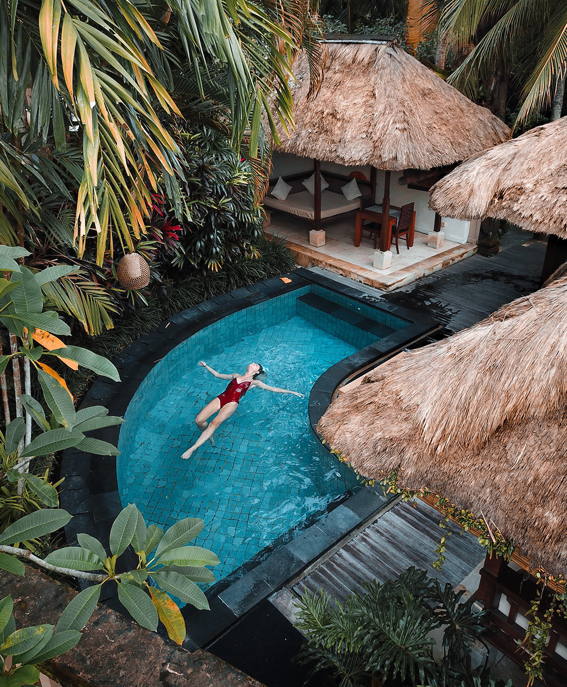 — Kompleks basenów zacieniony drzewami.